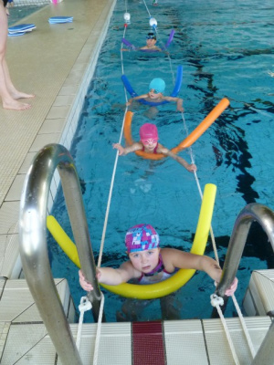 Avec le maître-nageur, on devait prendre une frite et sauter dans l’eau ou descendre les marches. Ensuite on devait traverser la piscine en se tenant au mur.