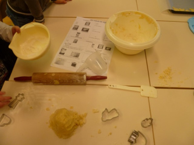 Le 18 décembre toute l’école a fait de la cuisine. La recette était celle des petits sablés. Il y avait plusieurs groupes dans chaque classe et sur chaque table il y avait 6 ou 7 personnes. Les groupes mélangeaient toutes les classes. Puis le soir on a demandé à des parents de les cuire au four. Et le lendemain on les a mangé. Avant de les manger chaque classe a chanté des chansons.